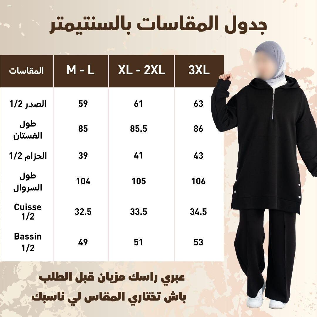 | المقاس | 1/2 الصدر | طول الفوقاني | 1/2 الحزام | طول السروال | Cuisse 1/2 | Bassin 1/2 |